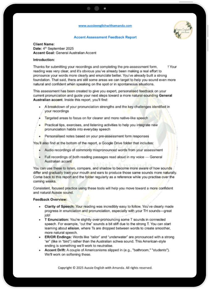Screenshot of Accent Assessment Feedback Report from Aussie English with Amanda, dated September 4, 2025, detailing pronunciation strengths, challenges, and tips for improving Australian accent.