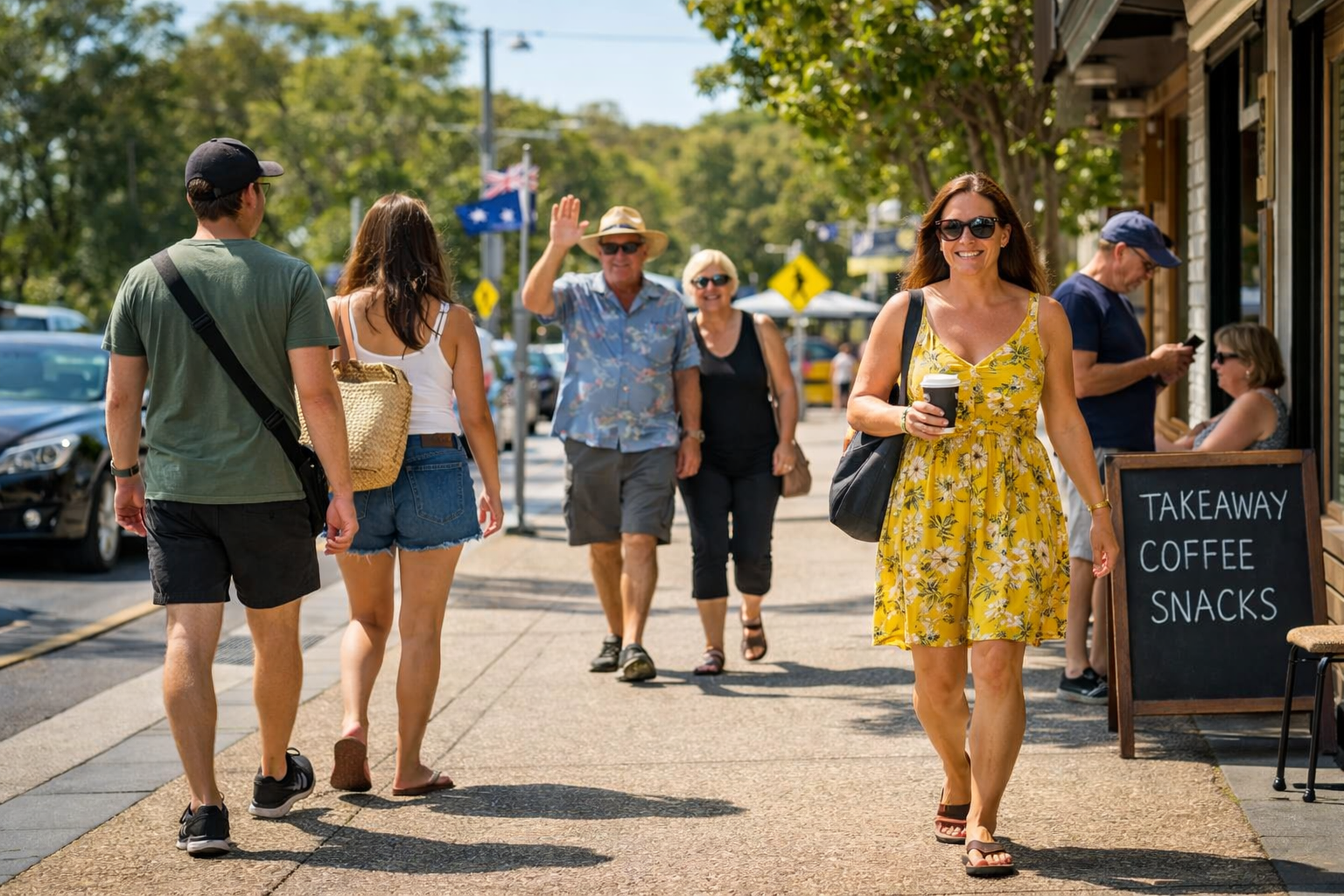 A photograph captures a typical Australian footpath with pedestrians and outdoor café seating – Image created by ChatGPT with DALL·E by OpenAI.