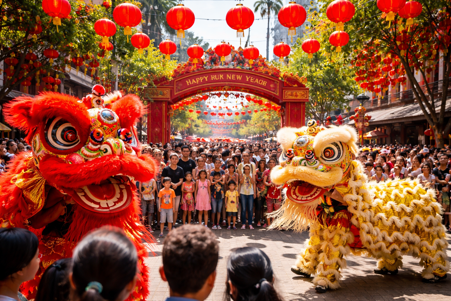 Lunar New Year celebrations in Sydney with lion dancers and red lanterns – Image created by ChatGPT with DALL·E by OpenAI.